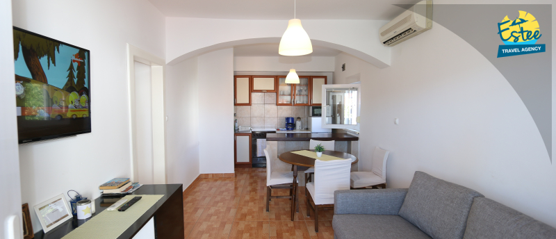 Eigene Balkon, Eine zusätzl. Schlafmögl. auf einer Schlafcouch möglich, Wohn-, Esszimmer und Küche sind eine Einheit, Fliesen, Klimaanlage, SAT TV, Balkon mit Blick auf das Meer